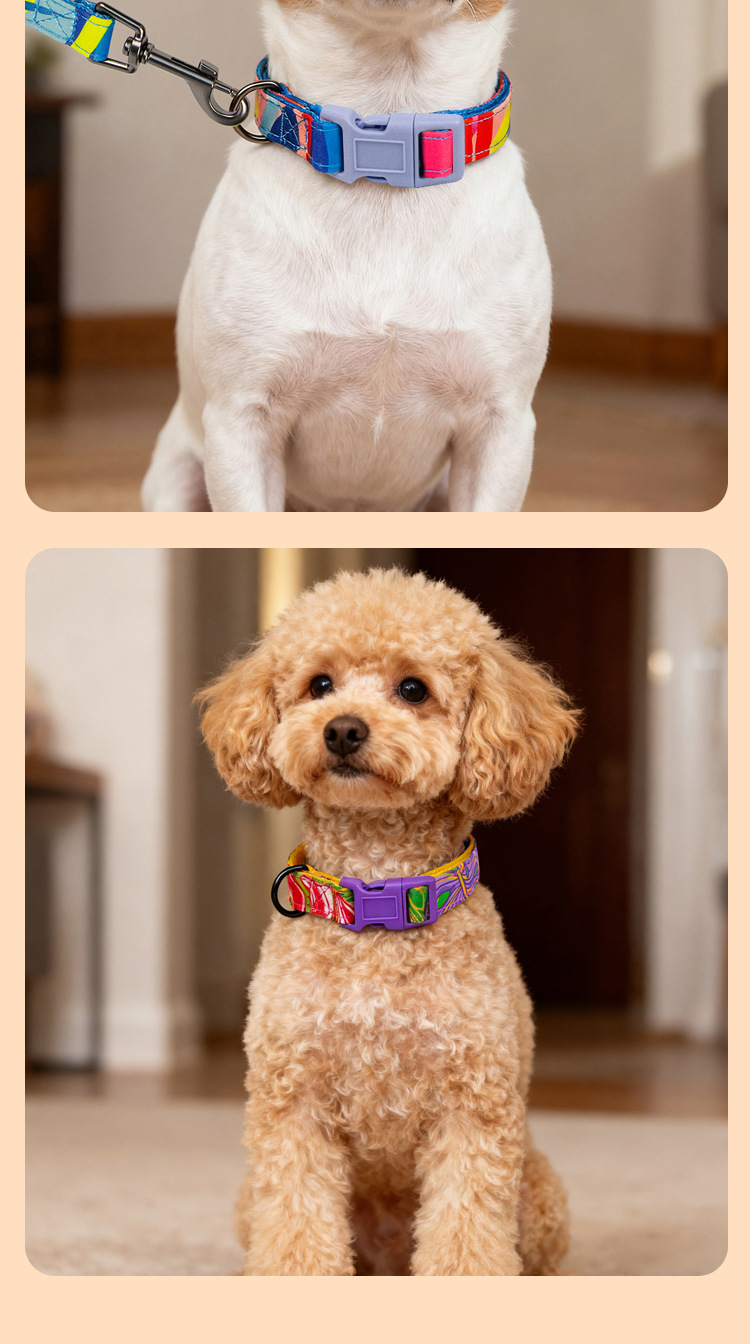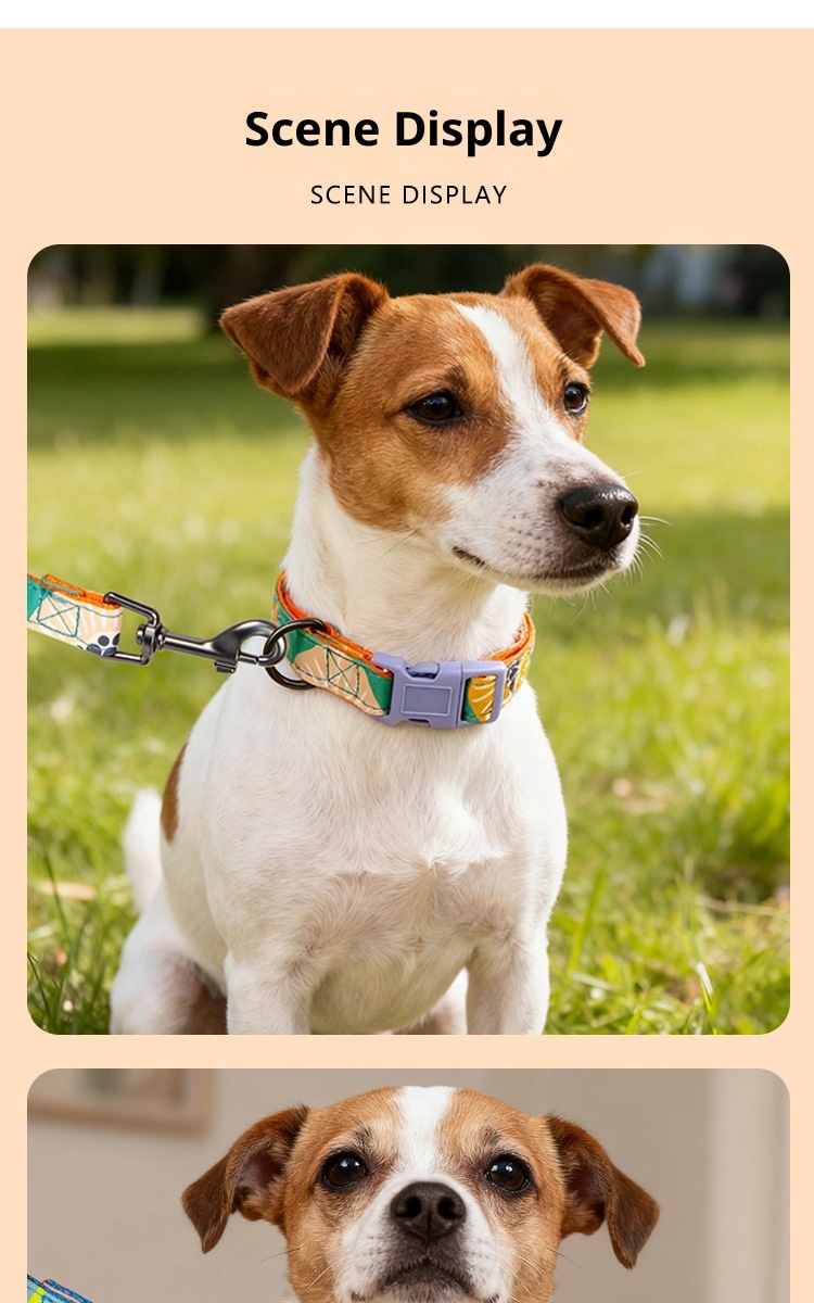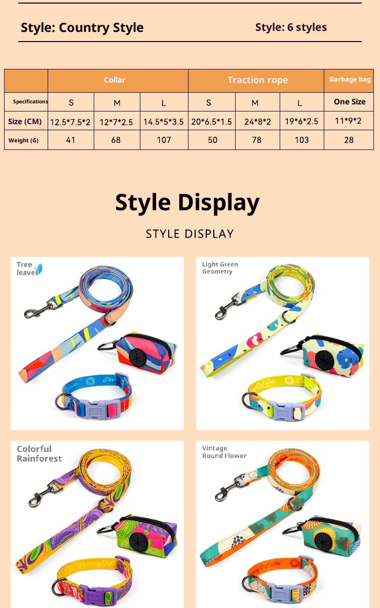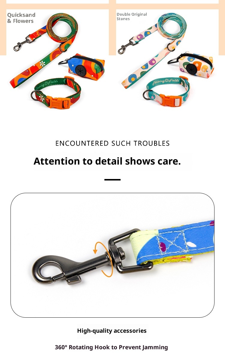 This pet gear is designed with colorful geometric patterns, with soft lining to enhance comfort, flexible buckle to ensure a perfect fit, combined with 360 ° rotation of the high-strength leash buckle and integrated poop bag hangers, providing a stylish, safe and convenient all-around solution for pets on the go, so as to escalate the experience of walking pets, and make the street turnover rate full.