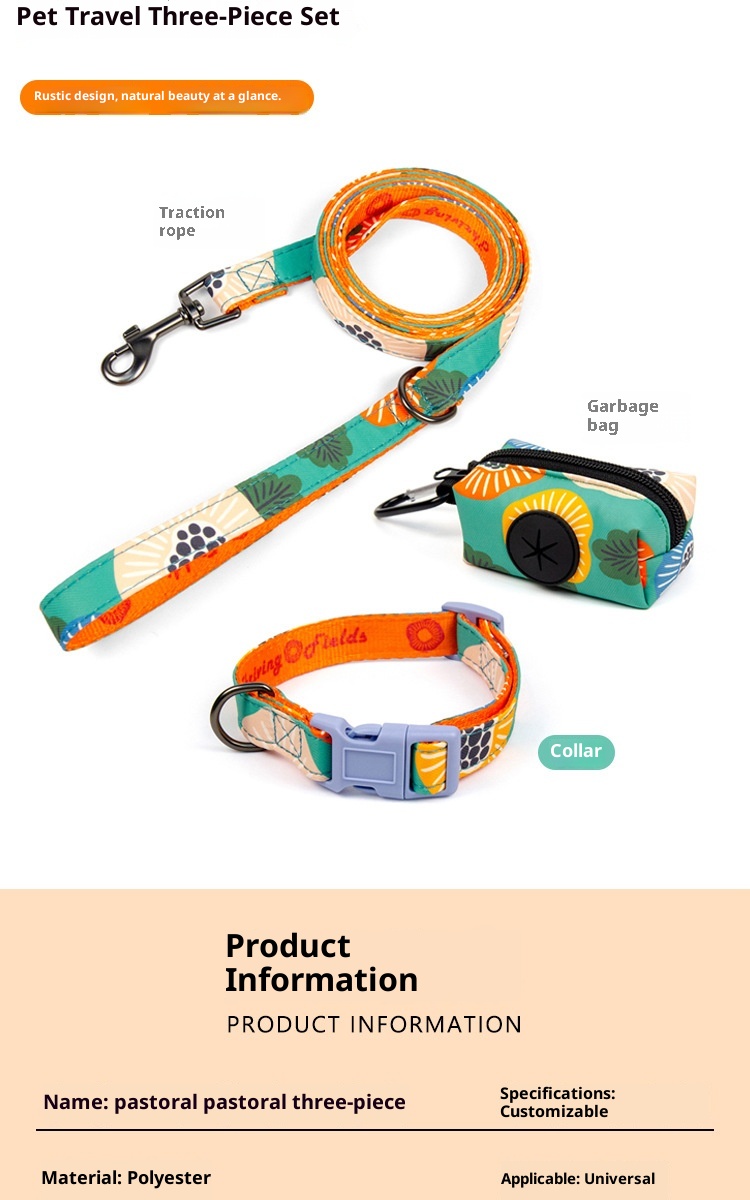【Pastoral Series】Pet Travel Set is designed for pet families who love nature and the outdoors. The collar and leash are made of eco-friendly, comfortable materials, paired with a portable storage bag for easy travel. "The beauty of nature goes beyond"—return to the pastoral life with your pet and enjoy moments of freedom.